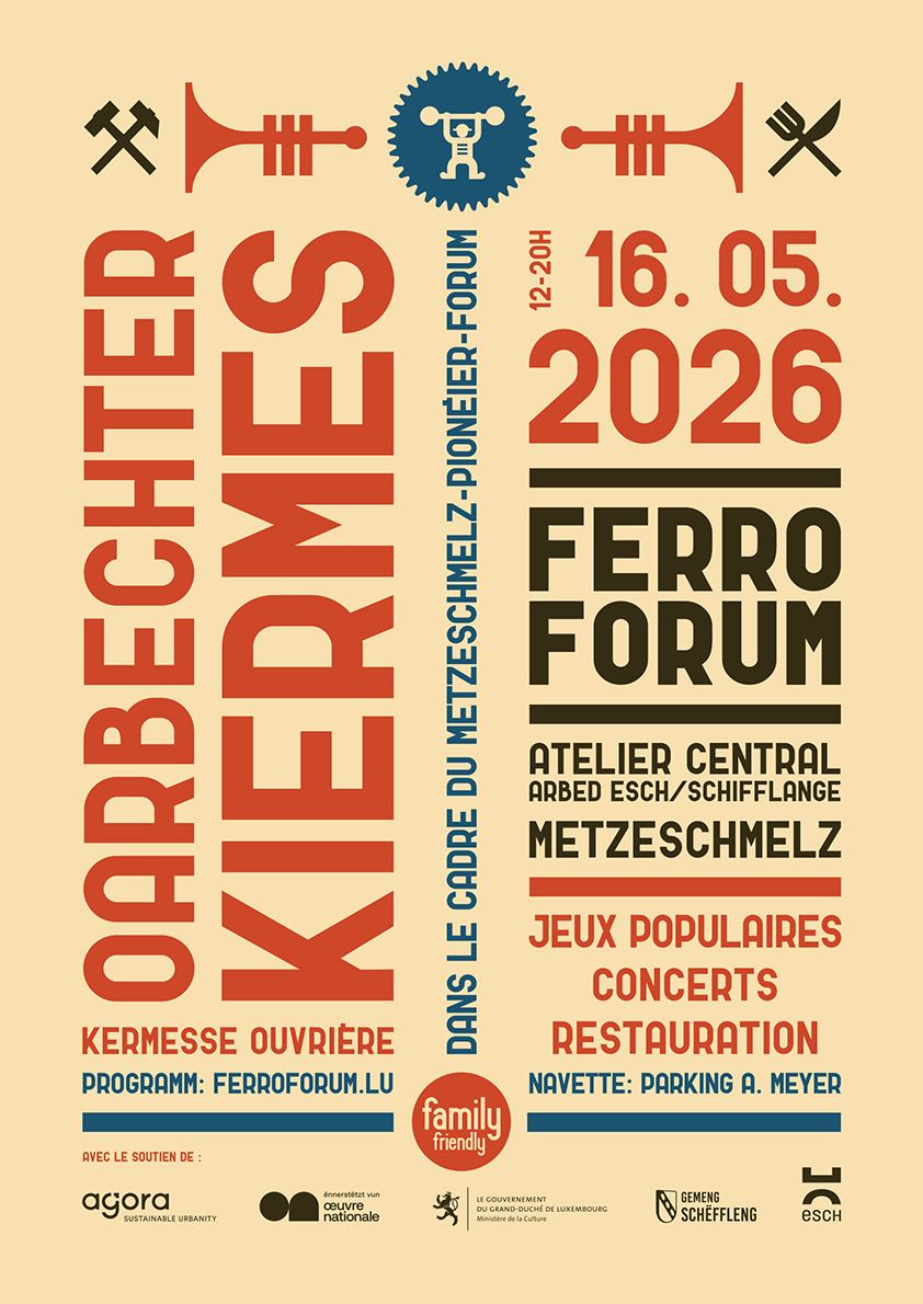 D’Ekipp vu FerroForum invitéiert Iech häerzlech op déi nächst Editioun vun eiser OarbechterKiermes, de Samschden, 16. Mee 2026 ab 12h am Zentralatelier vun der Metzeschmelz zu Esch-Schëffleng.